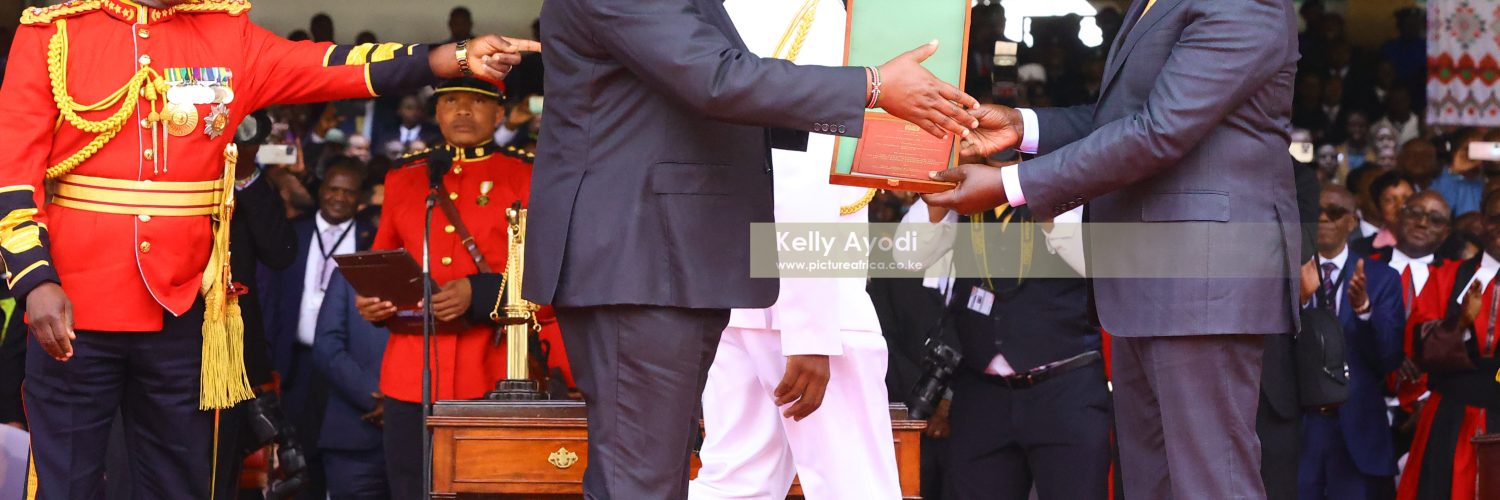 President Uhuru Kenyatta hands over the copy of the Constitution to the 5th President Of Kenya William Ruto as his Aide de Camp Brig Timothy Stelu Lekolool salutes him for the very last time as his personal assistant.
